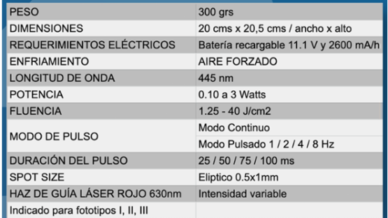 El pico más alto de absorción de la Hemoglobina (Hb) se encuentra entre 400-450nm de longitud de onda (Fig. 1) *El ORskin Blue, un Diodo Laser de GaN (Nitruro de Galio) 445nm, se encuentra en el rango óptico ideal para el tratamiento de lesiones superficiales con alto contenido de Hemoglobina y/o melanina, permitiendo la utilización de potencias menores, optimizando los recursos. Estas propiedades físicas del ORskin Blue, nos permiten utilizar una Fluencia (Energía aplicada sobre un área determinada) ideal según la bibliografía autorizada en el tratamiento de este tipo de lesiones con Laser de luz visible.